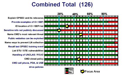 Metrics from interviews are focus-area indicators. Keep the number of questions to ten or twelve. Ask open-ended questions, but grade them as “yes” or “no.” Therefore, data from hundreds of interviews can be simply captured in spreadsheet form. For example, ask, “Explain what OPSEC is and why it is important.” Correct responses will be marked “yes” and incorrect responses marked “no, “as the following slide depicts:
