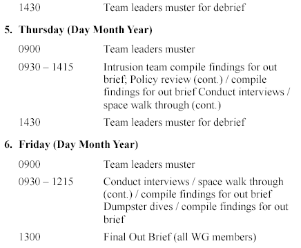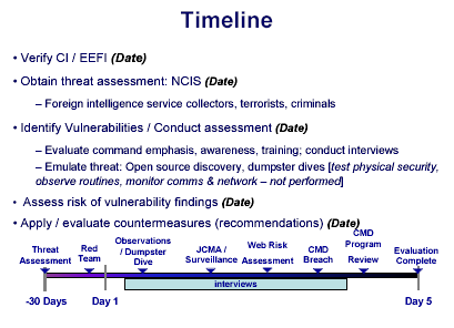 Commander, NETWARCOM recently commented on the persistence of adversarial intent and capability: “The threat vector is 360 degrees, the enemy is ever vigilant probing and collecting 24/7, and our information is constantly at risk, at work and at home. You must be at GQ round the clock.” In order to understand what threats are relevant to your organization, obtain a local threat briefing from the organization’s intelligence representative or Service investigative branch agent (i.e. Navy would contact the Naval Criminal Investigative Service [NCIS]). The presentation will provide actual adversarial intentions and capabilities that need to be emulated in support of the assessment. This brief should be presented prior to the execution phase of the assessment, as it will raise the level of awareness of all personnel. Without this brief, an assessment may focus on erroneous adversary capabilities and portray irrelevant vulnerabilities.