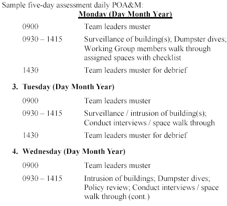 6. Contact command Intelligence department, (i.e. N2, G2, S2, J2 etc.) or Service investigative branch (i.e. NCIS, OSI, CID, etc.) for a threat brief / analysis of local threat intent and capabilities. Proceed to step 7. 7. Assign team leads for designated portions of the assessment (i.e. Dumpster dive, Interviews, Observations, etc.). Proceed to step 8.