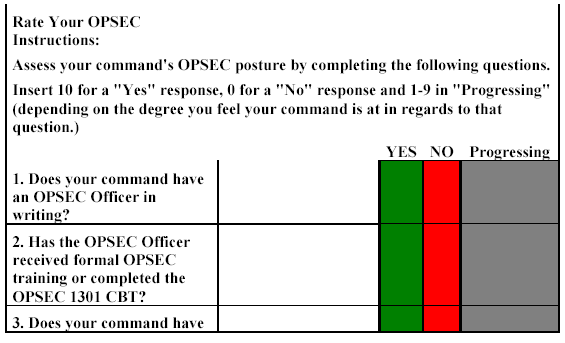2. In the event you answered “No” to the Rate your OPSEC survey questions: (1), (2), (3), (5), or (6), then corrective action needs to be taken prior to conducting an assessment. When the survey answers are “Yes” or found to be satisfactory, proceed to step 3.