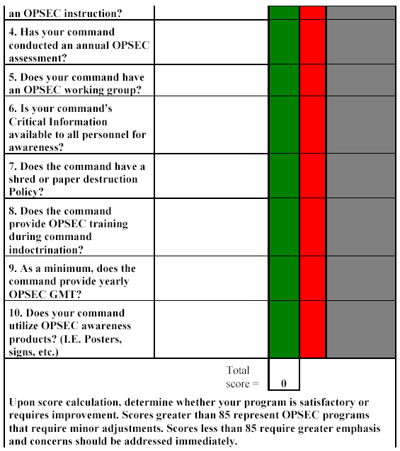 During this portion of the assessment, a designated team member from the working group should review all applicable documentation and procedures related to the organization’s OPSEC program. For example, has the OPSEC Officer and working group members obtained current letters of designation? Has training been conducted and documented? Have instructions and standard operating procedures (SOPs) been updated? Use the checklist below to gauge the adequacy of your program: