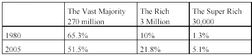 But didn’t the majority of Americans still see a growth in income as a result of the efforts of the rich and the superrich? No. Income for the bottom 90 percent of Americans actually dropped relative to inflation, and they had less money to spend each week. The result is a country whose income distribution matches that of third-world nations like Brazil and Russia.