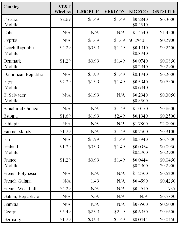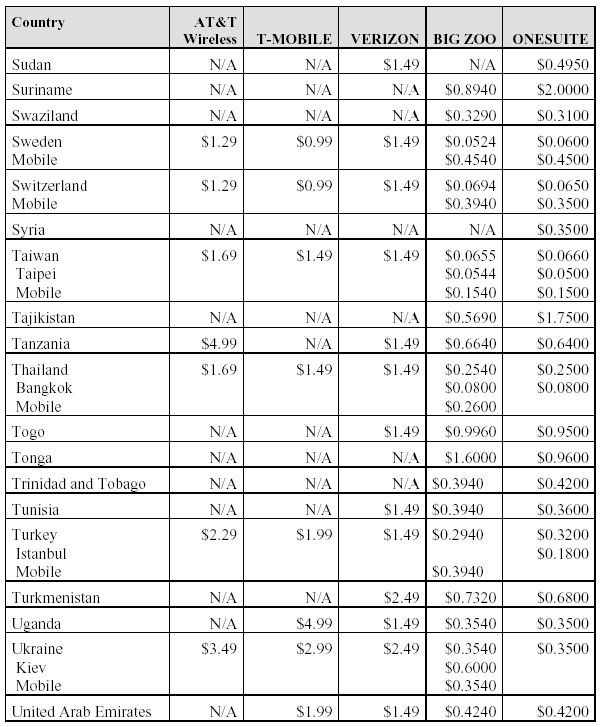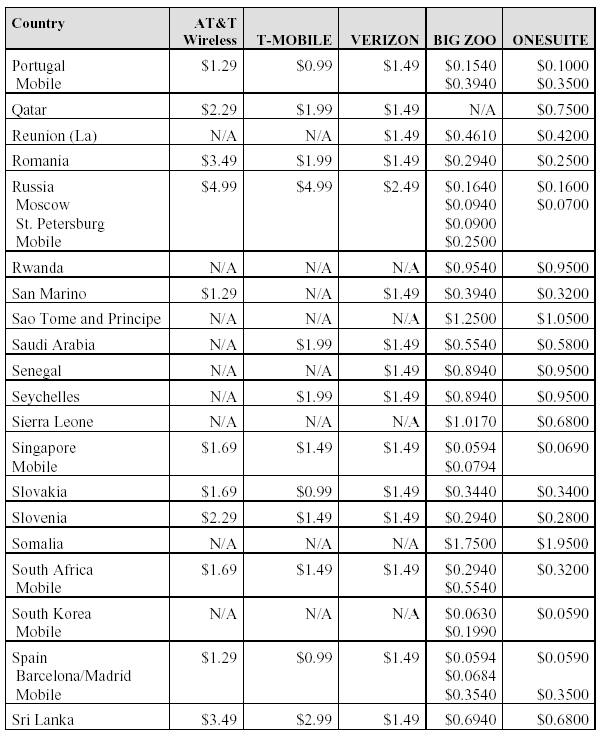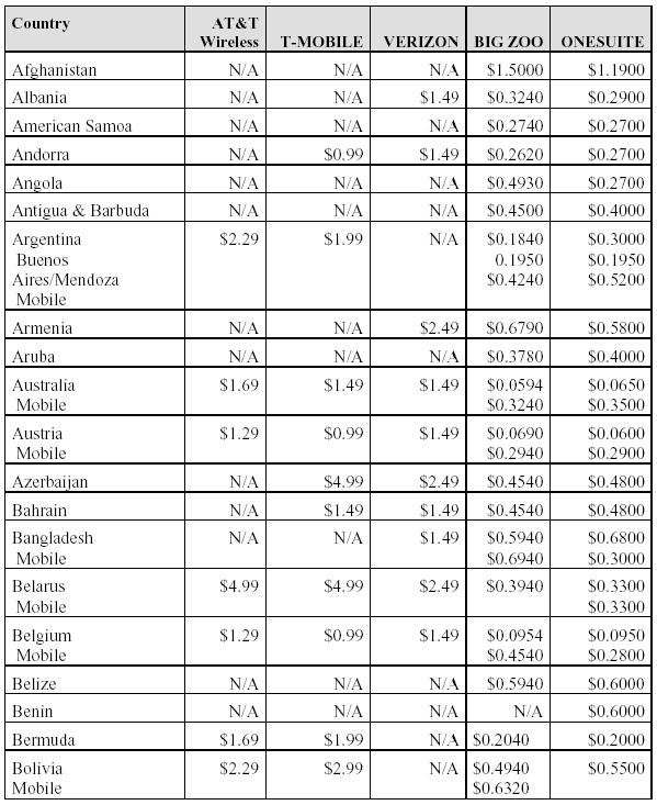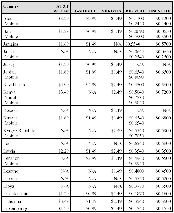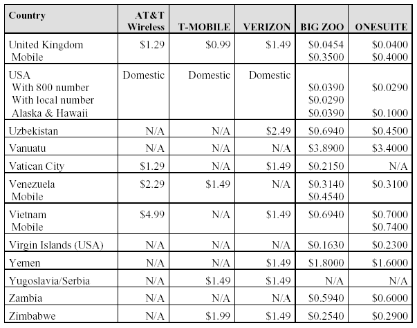 Below find a comparison of international roaming rates within (or receiving calls from theUS) for the two international service providers that provided us with rates (as well as the “unofficial” rates for AT&T Wireless): We felt that having the side-by-side comparison would be more useful than merely listing the web sites. We have also included the costs for calls from the US to other countries with two of the prepaid calling services, Big Zoo (http://www.bigzoo.com/) and OneSuite (http://www.onesuite.com/). With these services, you prepay into your account, and then program your access number and PIN into the calling card setting on your handset. For most handsets, the way you use the calling card is to select the number and hold the send button down. The handset will then dial the access number and ask for the PIN, at which point you hit the send button again. It will then ask you for the phone number to be dialed, and you hit the send button again. Is it worth the extra effort? Depends on who you are. In The LUBRINCO Group we use these services both with cell phones and for long distance with our landline phones. On the other hand, in other circumstances we might not care so much about saving the company a few pennies – or even a few dollars – per call.