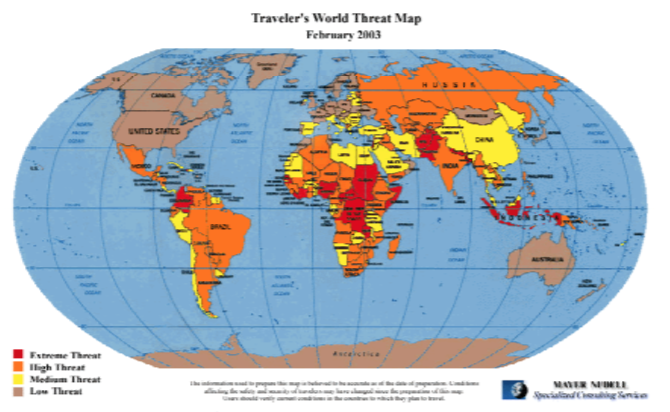 The first is The Traveler’s World Threat Map (annual individual subscription price of $50), a graphical depiction of where one faces danger. It provides a good reminder not merely that a given place is dangerous, but that a place we thought to be merely dangerous has become very dangerous.